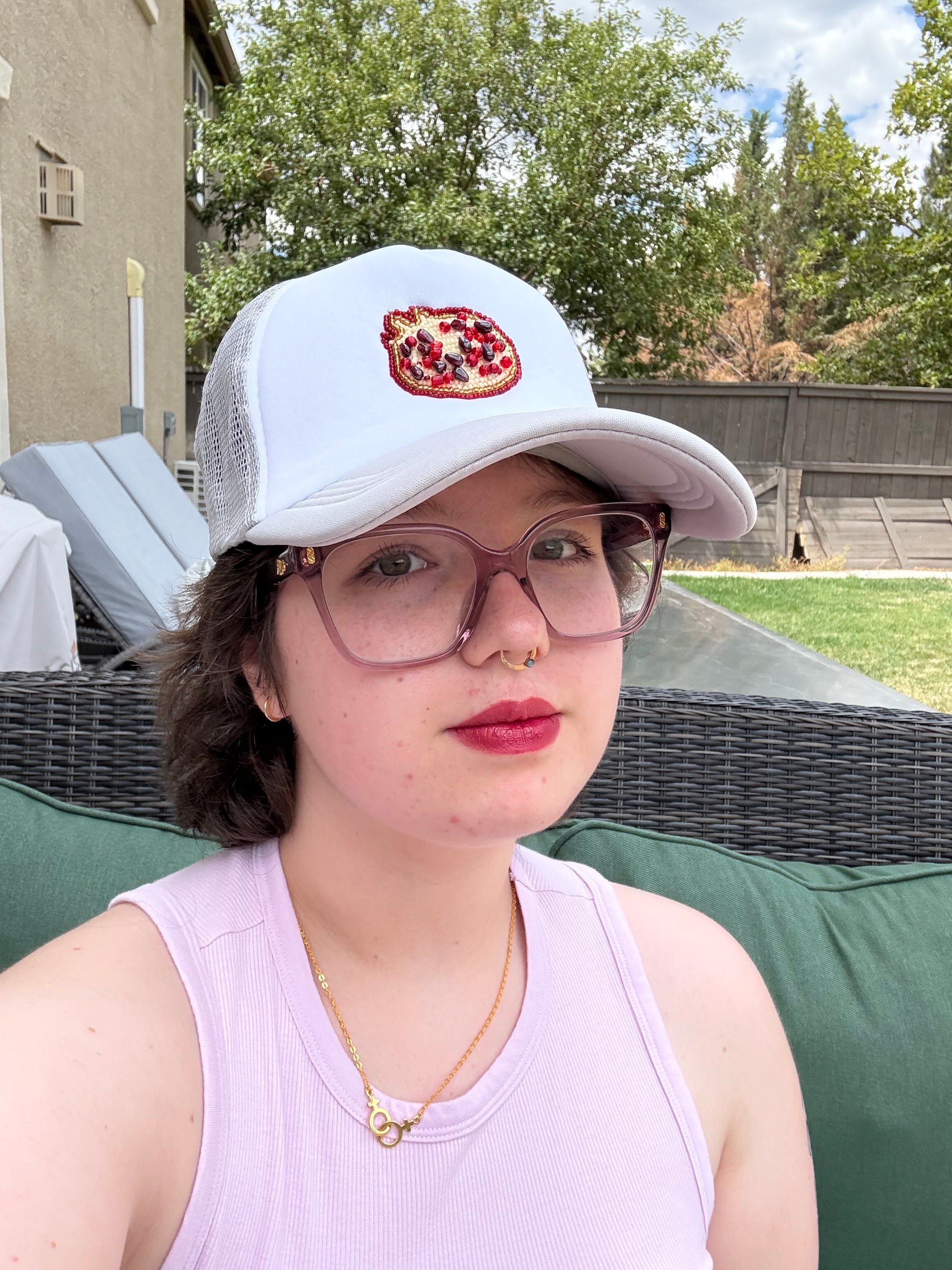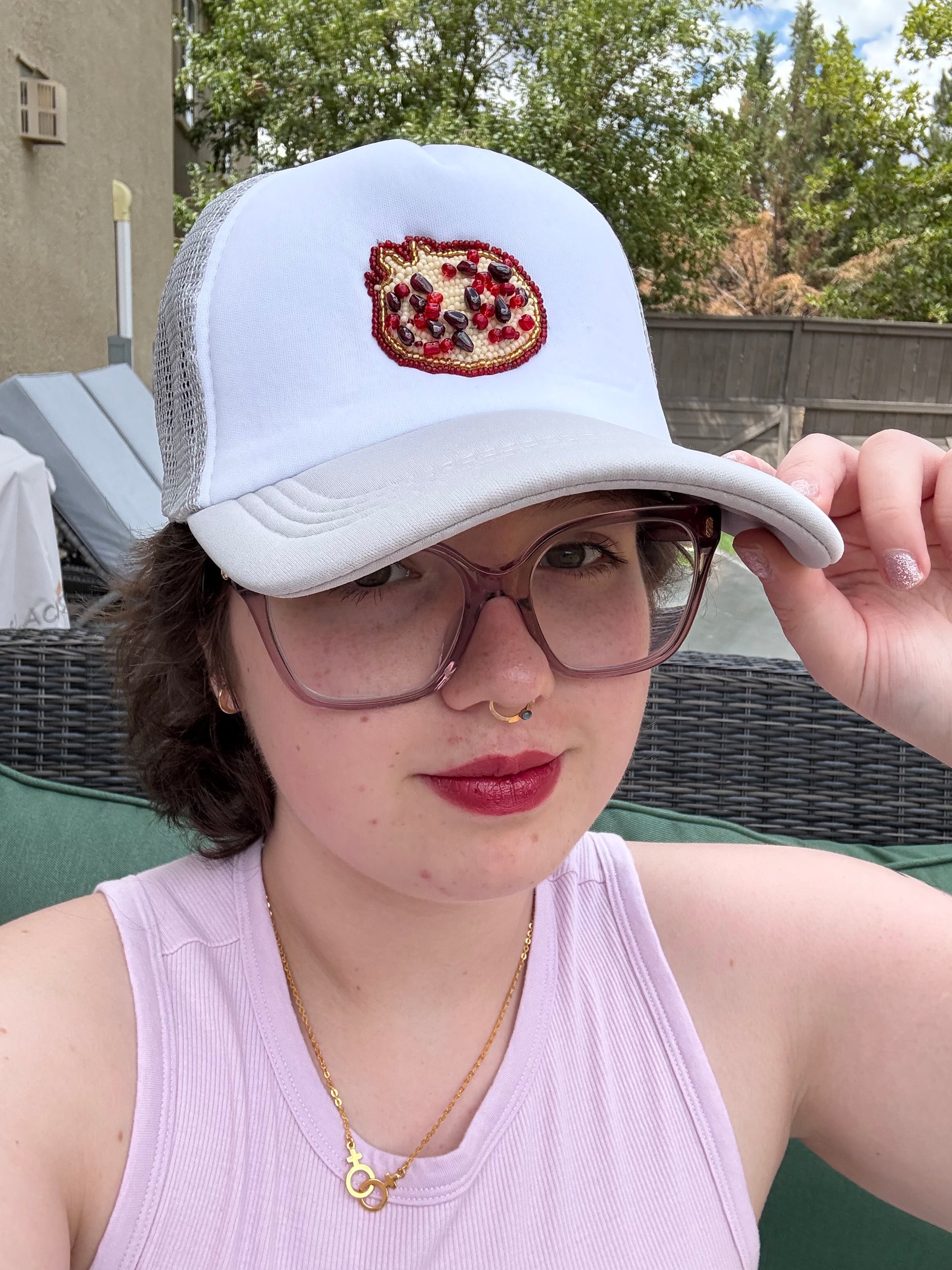 Made with glass seed beads, along with some real garnet “pomegranate seed” beads. All beadwork is sealed with interfacing on the back.