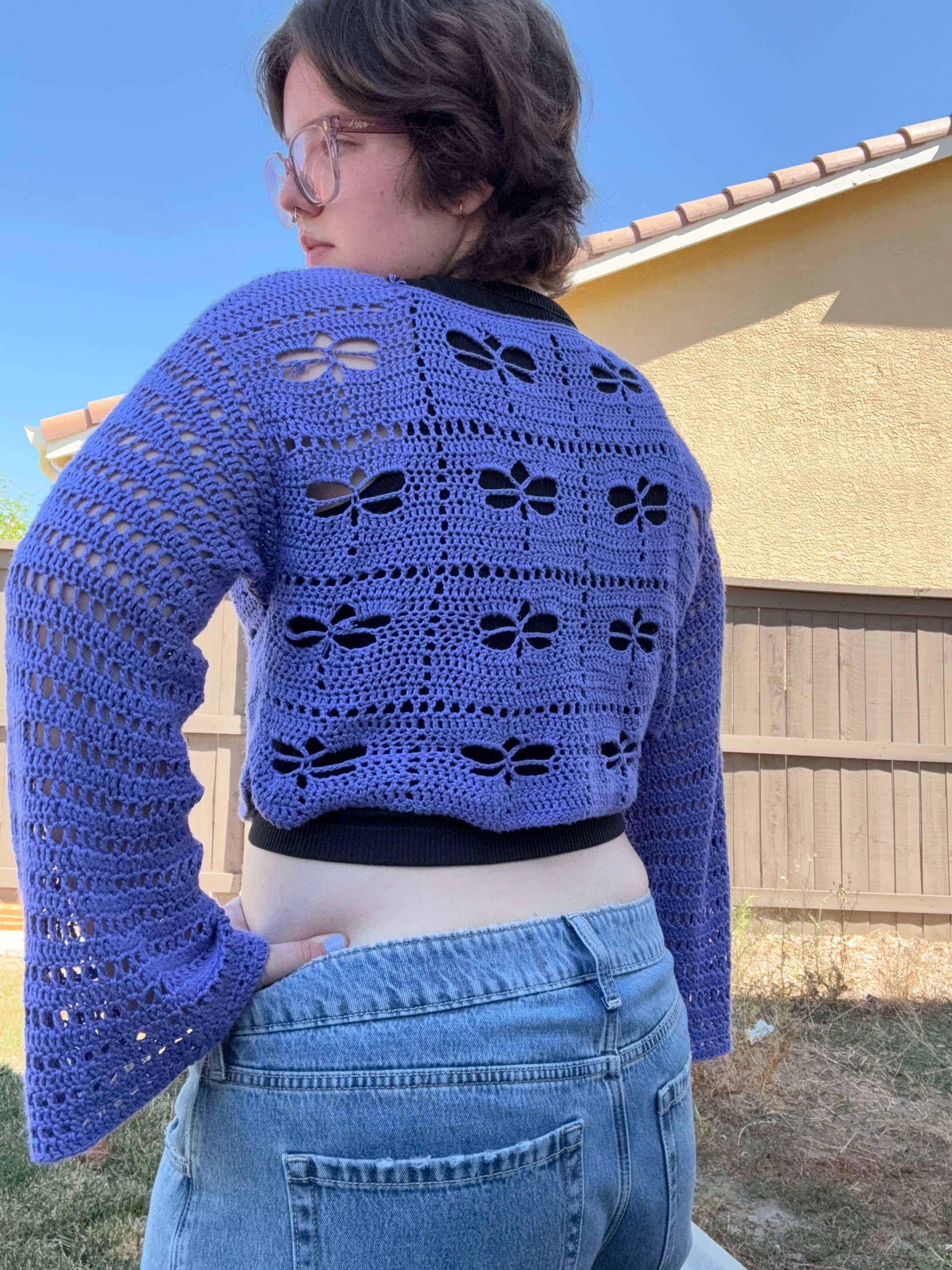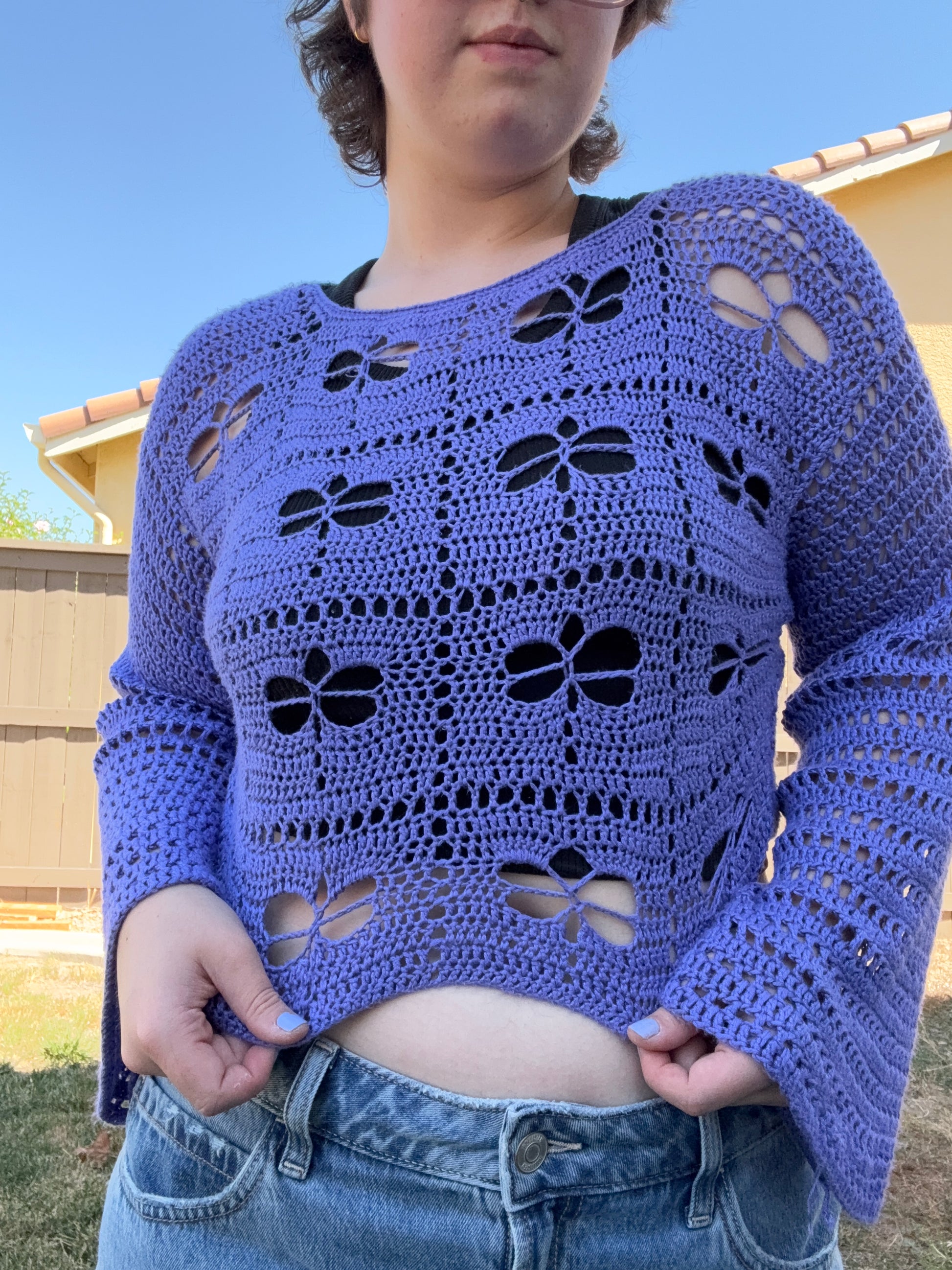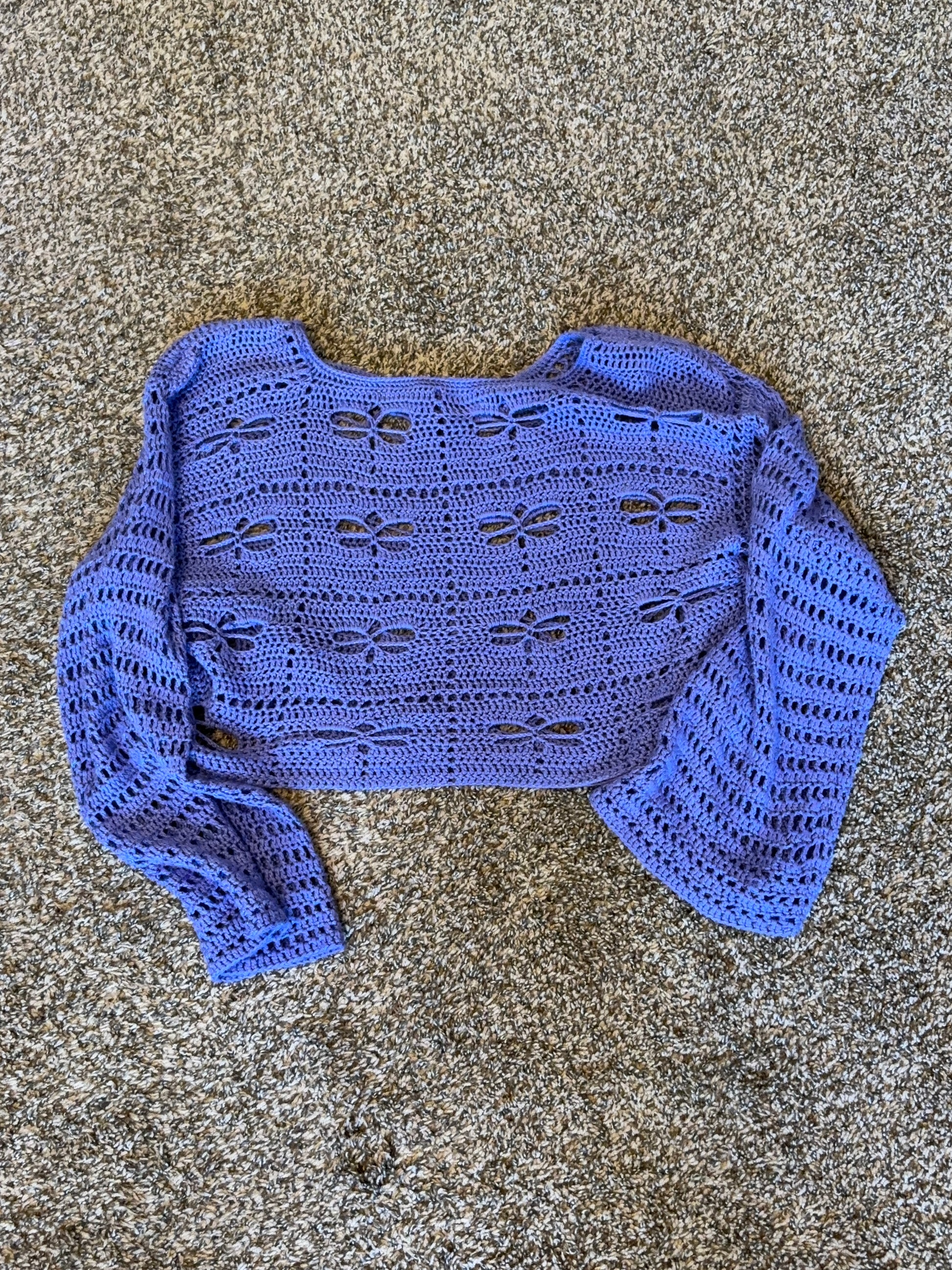 This exclusive medium Purple Crochet Dragonfly Sweater is a one-of-a-kind handmade piece, crafted to showcase intricate dragonfly motifs. Hem is not stretchy