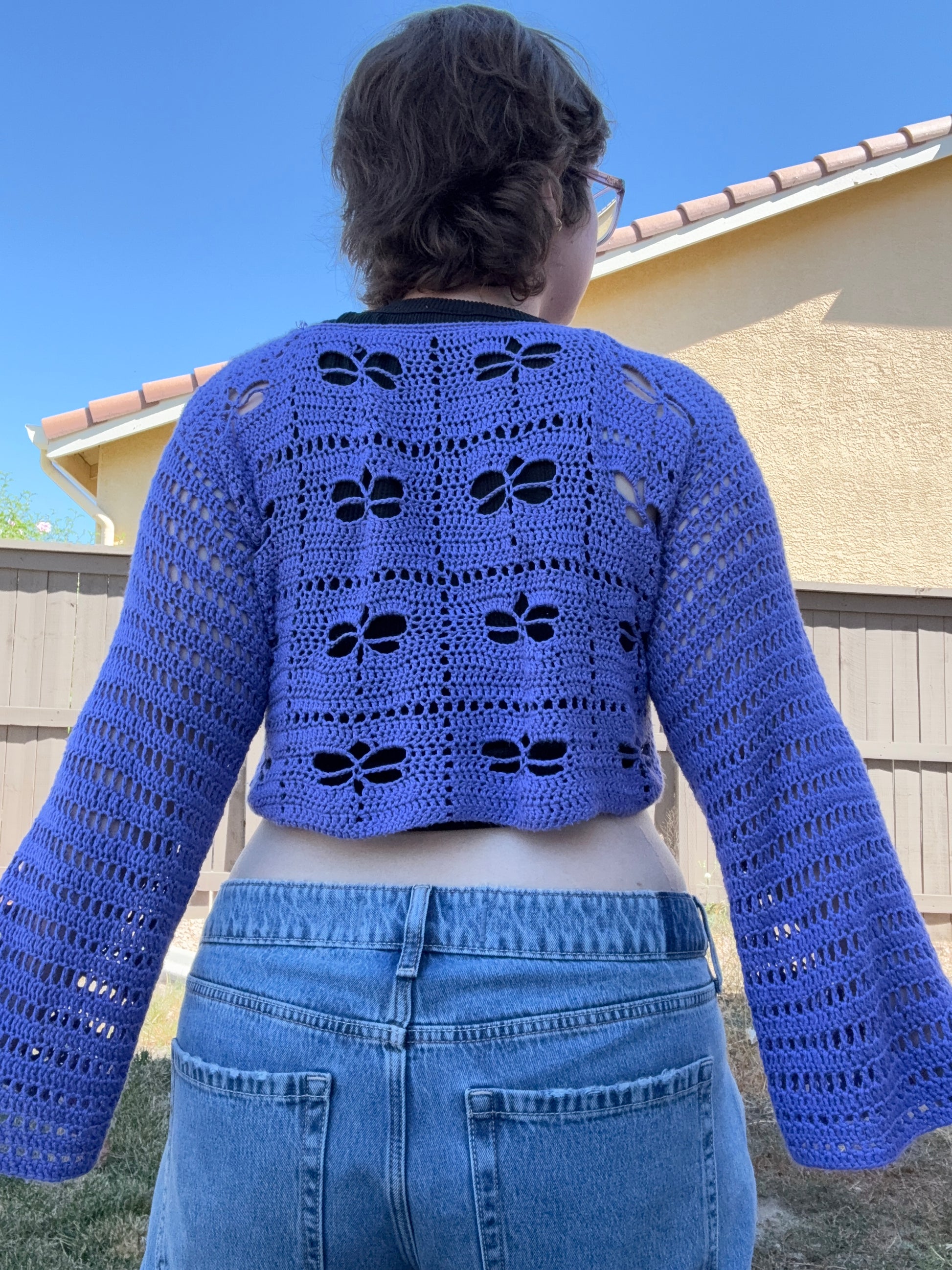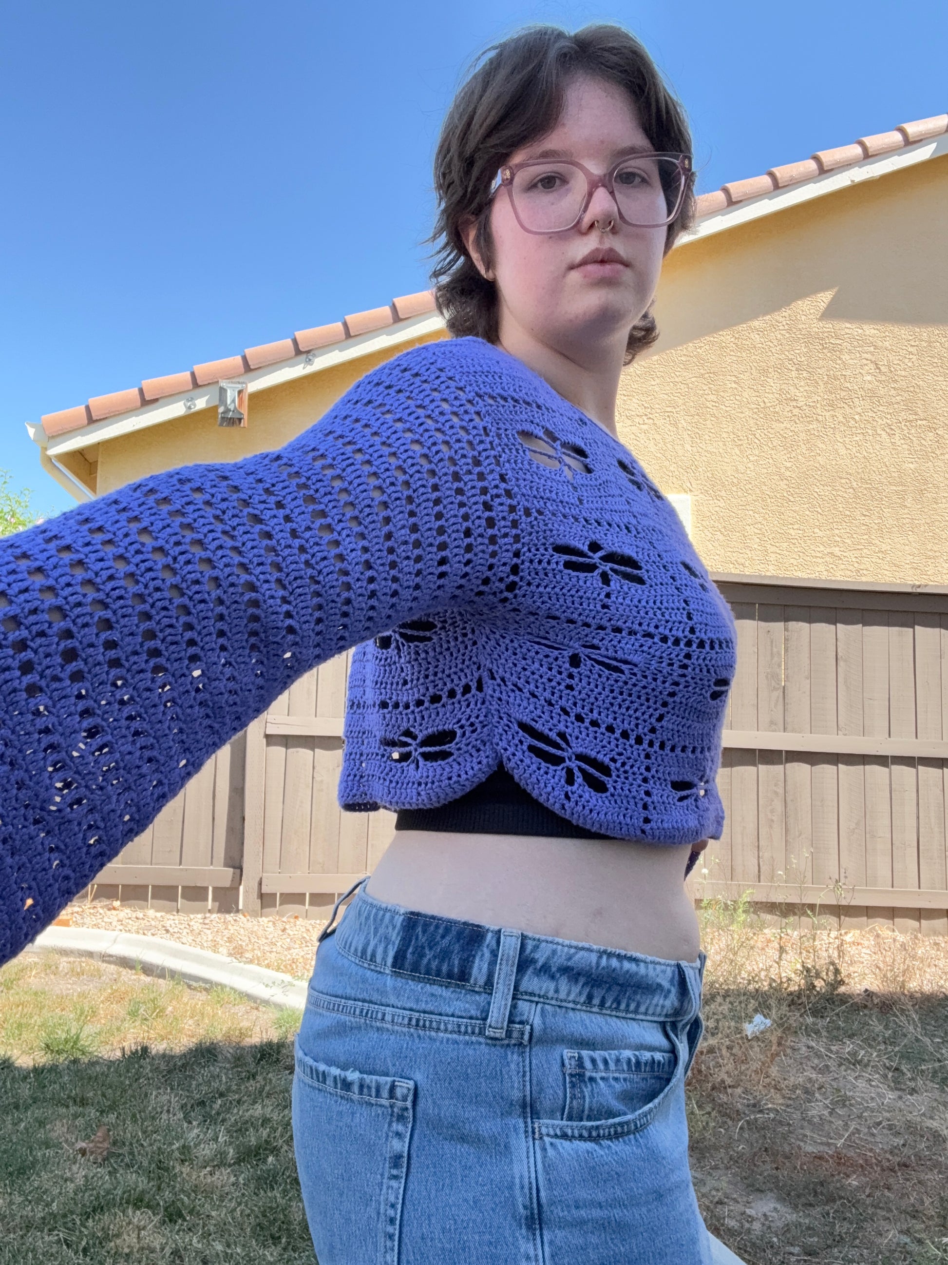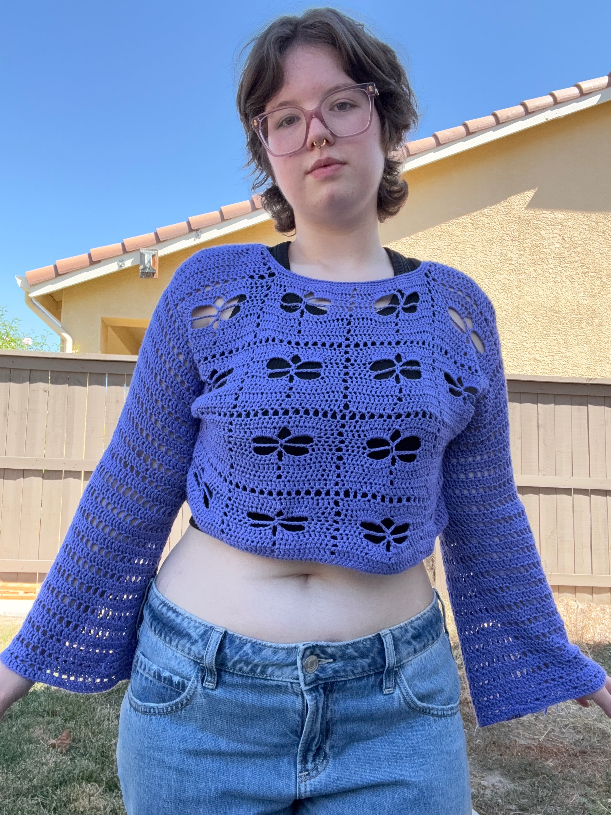 This exclusive medium Purple Crochet Dragonfly Sweater is a one-of-a-kind handmade piece, crafted to showcase intricate dragonfly motifs. Hem is not stretchy